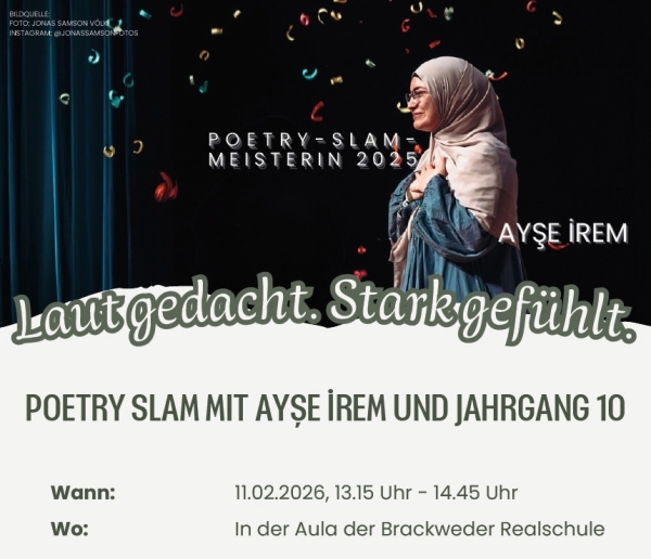 Am Mittwoch, den 11.02.2026, findet von der 1.-8. Stunde für den Jahrgang 10 unserer Schule eine besondere kulturelle Veranstaltung statt: ein Poetry-Slam mit der Autorin und Poetry-Slammerin Ayşe İrem (Deutsche Meisterin 2025).